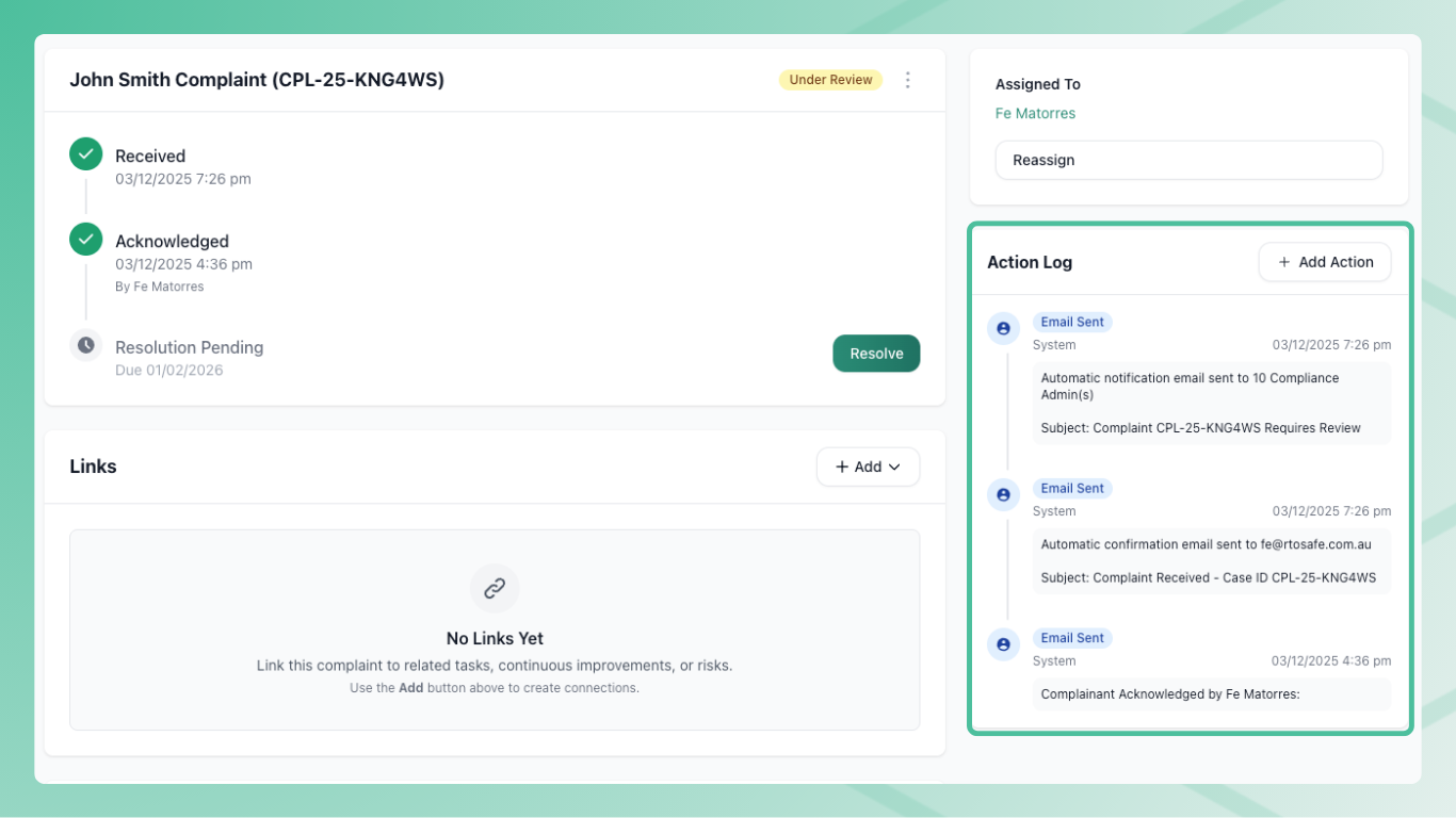 Use action logs to document everything you do while handling a complaint. From the complaint details page, select Add Action.
