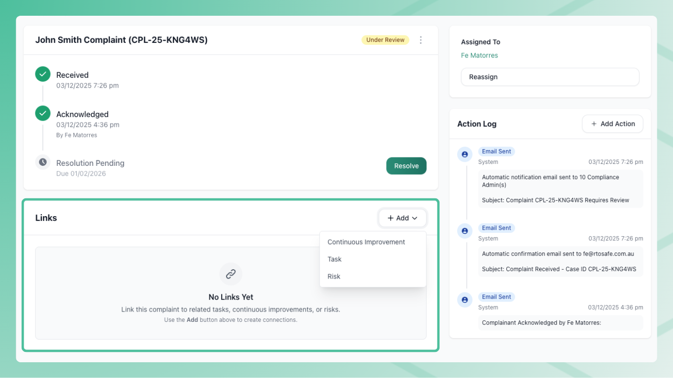 - Resolution overdue — Complaint wasn’t resolved within your configured timeframe