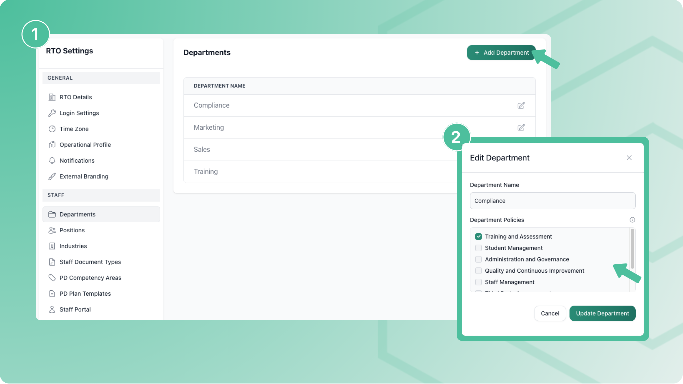 For example, an “All Staff” department might need Staff Management, Administration, and Governance — while a “Trainers” department might also need Training and Assessment.