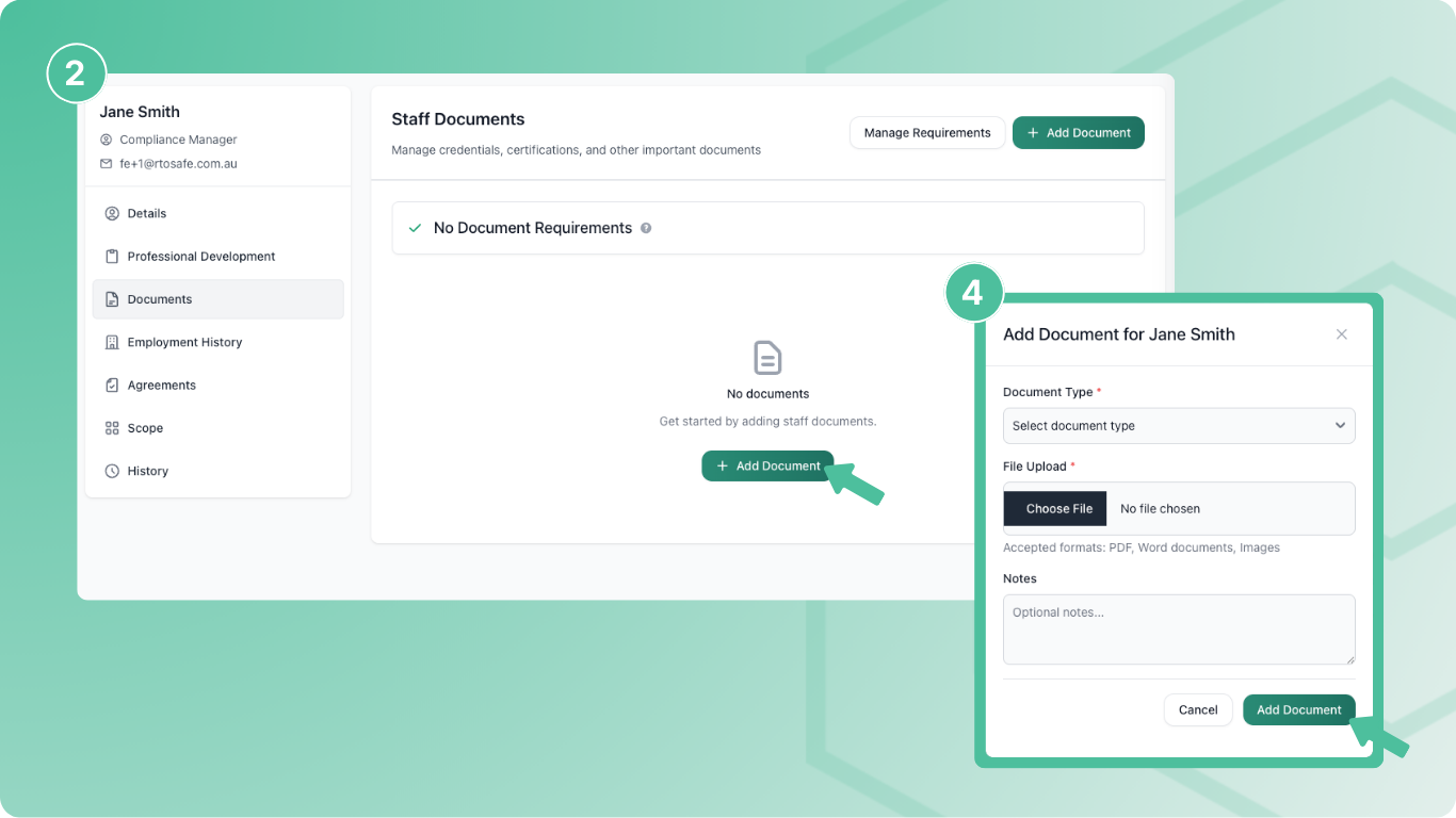 Staff documents track credentials (like First Aid and TAE qualifications), employment records, and other files. Staff can upload their own documents through the Staff Portal, or you can add them on their behalf.
